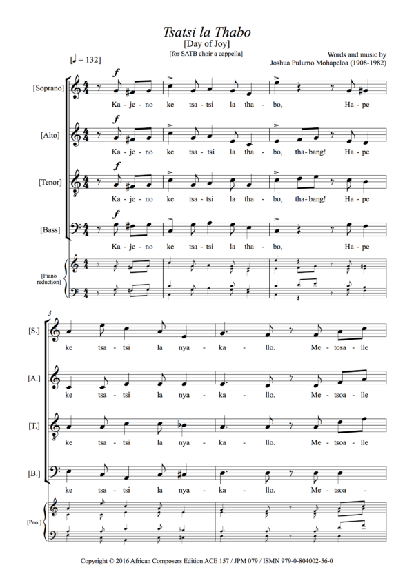 This song for three female voices about judgment day is somewhat ambivalent: we are not sure if this is the ‘Day of Judgment’ in the Christian sense, nor do we know if it is to be welcomed or feared. The reason is that Tsatsi La Pallo is jaunty and jovial throughout, dominated by a rhythmic figure that seems to be trying to dispel any sense of disquiet while the lyrics refer to drumming and ‘beating in twos and threes’; this might even be a reference to African rhythm. Rhythm prevents doubt building up, in any case; but somehow below the surface, uncertainty remains. Like all of Moerane’s songs for Soprano and two Altos, this one is ingenious in its handling of harmony, counterpoint, and phrasing. In order to help choirs learn this song, a free mp3 of the lyrics spoken by Mpho Ndebele is downloadable when the song is purchased along with a rehearsal mp3 of the song at a slow tempo.
