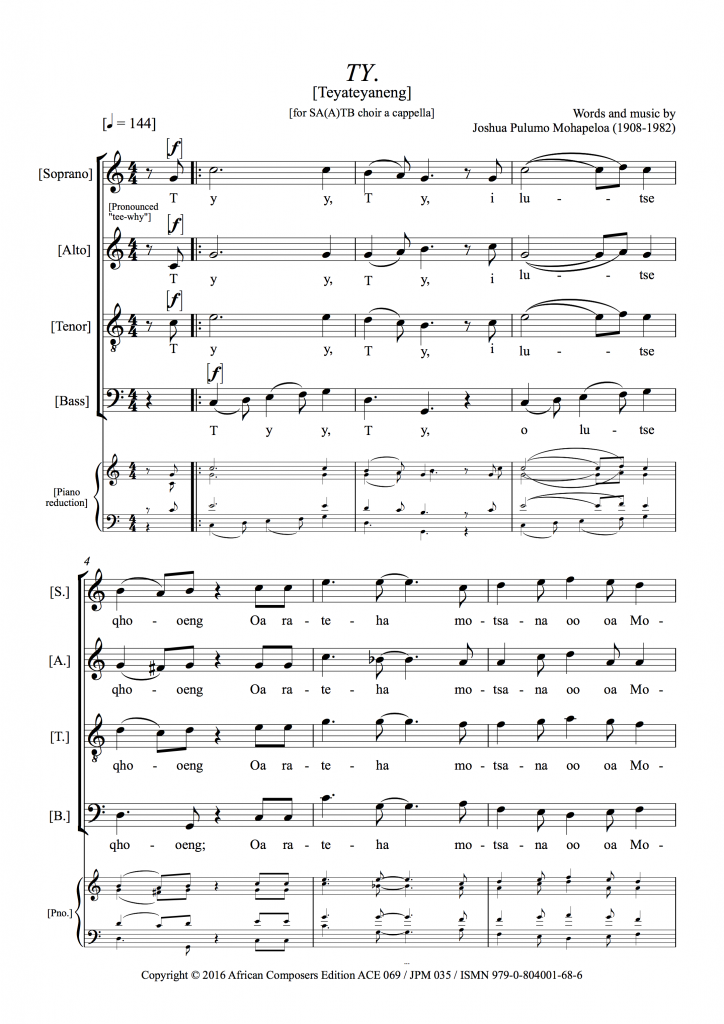 ‘TY’ was first published in 1939 and republished in 1976. It is one of many songs Mohapeloa wrote about places in Lesotho. In his day, ‘Teyateyaneng’, often abbreviated ‘TY’ in Lesotho, would have been a village. Today it is quite a bustling small town. It is very likely, as the text says, that Mohapeloa had friends and family members living there. This could however be true of many other places in Lesotho, which is a very small and tightly knit country where people are often related through extended families or clans.